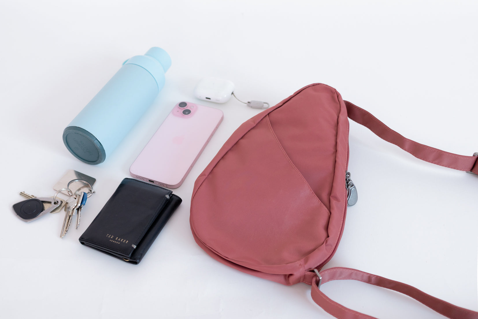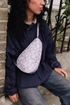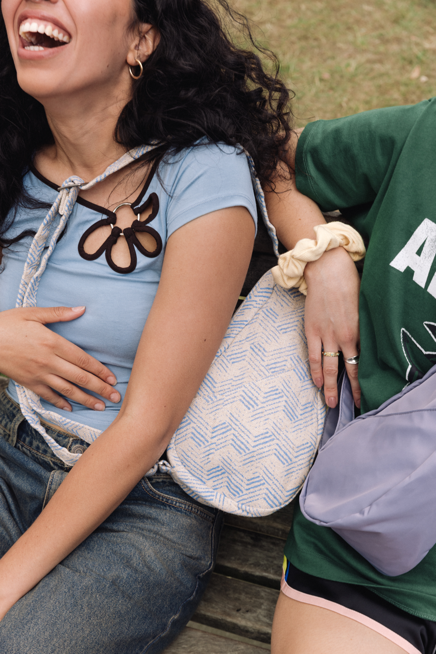 Made from a soft grey fabric with a subtle dotted pattern. Comfortable and easy to wear, this sling bag carries what matters - nothing more, nothing less. There’s space for your phone, wallet, keys, and sunglasses, plus room for a small water bottle or compact umbrella when the day calls for it.